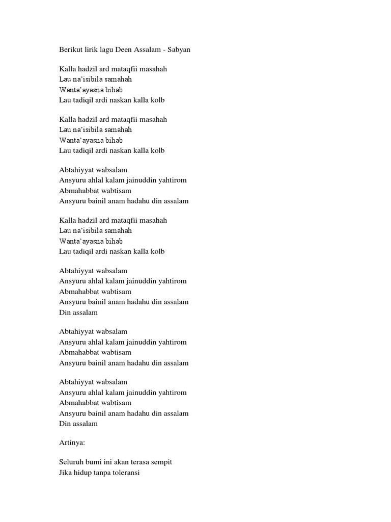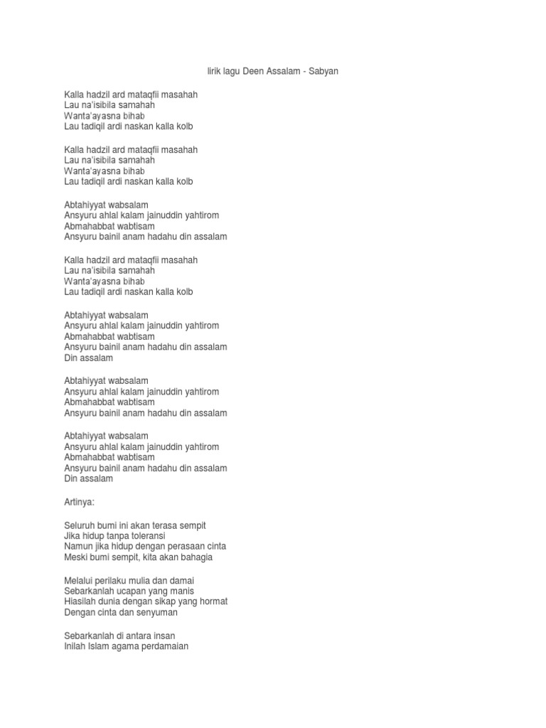 Doc Lirik Lagu Abtahiya Wassalam Deen Assalam Bayu Ariwibowo Academia Edu