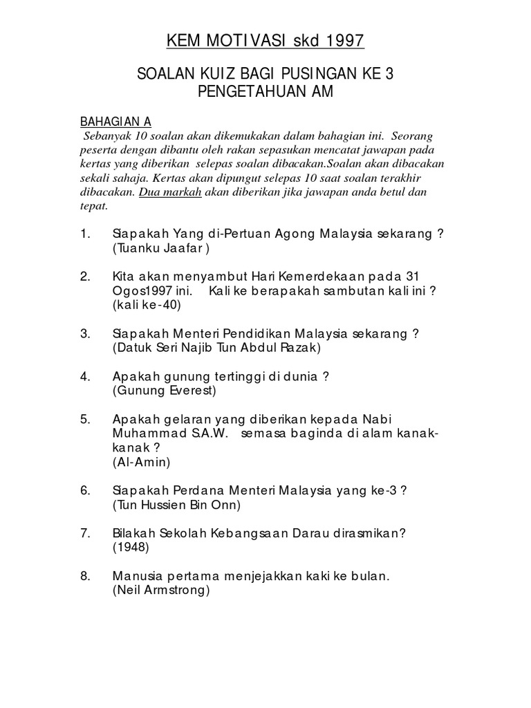Kem Motivasi Skd 1997 Soalan Kuiz Bagi Pusingan Ke 3 Pengetahuan Am